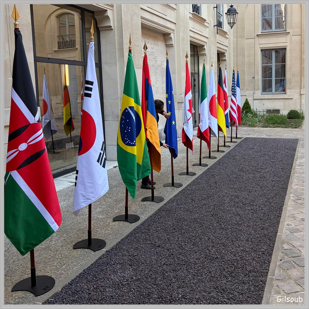 Moi, planqué dans ma régie, je me contente d’observer toutes les petites mains qui courent à droite et à gauche pour déplacer ici une étiquette, là, vérifier l’alignement d’une chaise ou d’un verre. Ce qui m’amuse, c’est la gestion des drapeaux, le Français toujours coté orateur et à côté, l’Européen, avec ses étoiles qui doivent être en partie visibles. Le pliage pour bien tomber, et bien sûr, sans un pli (sic) ; j’en ai vu galérer un moment. Petit souvenir au Palais des congrès du Futuroscope de Poitiers, Fillion, alors Premier ministre, devait venir clore deux jours de colloque dont je ne me rappelle plus le thème. L’équipe de Matignon est arrivée avec le pupitre, sur mesure, et les drapeaux. Ils ont mis pas loin de deux heures à tout caler, pour, qu’à l’image de la caméra de face, tout tombe au millimètre près, sans faux plis.